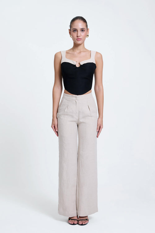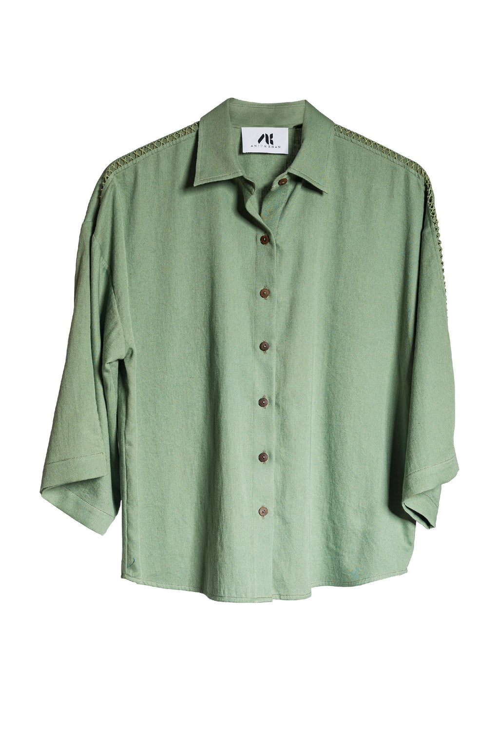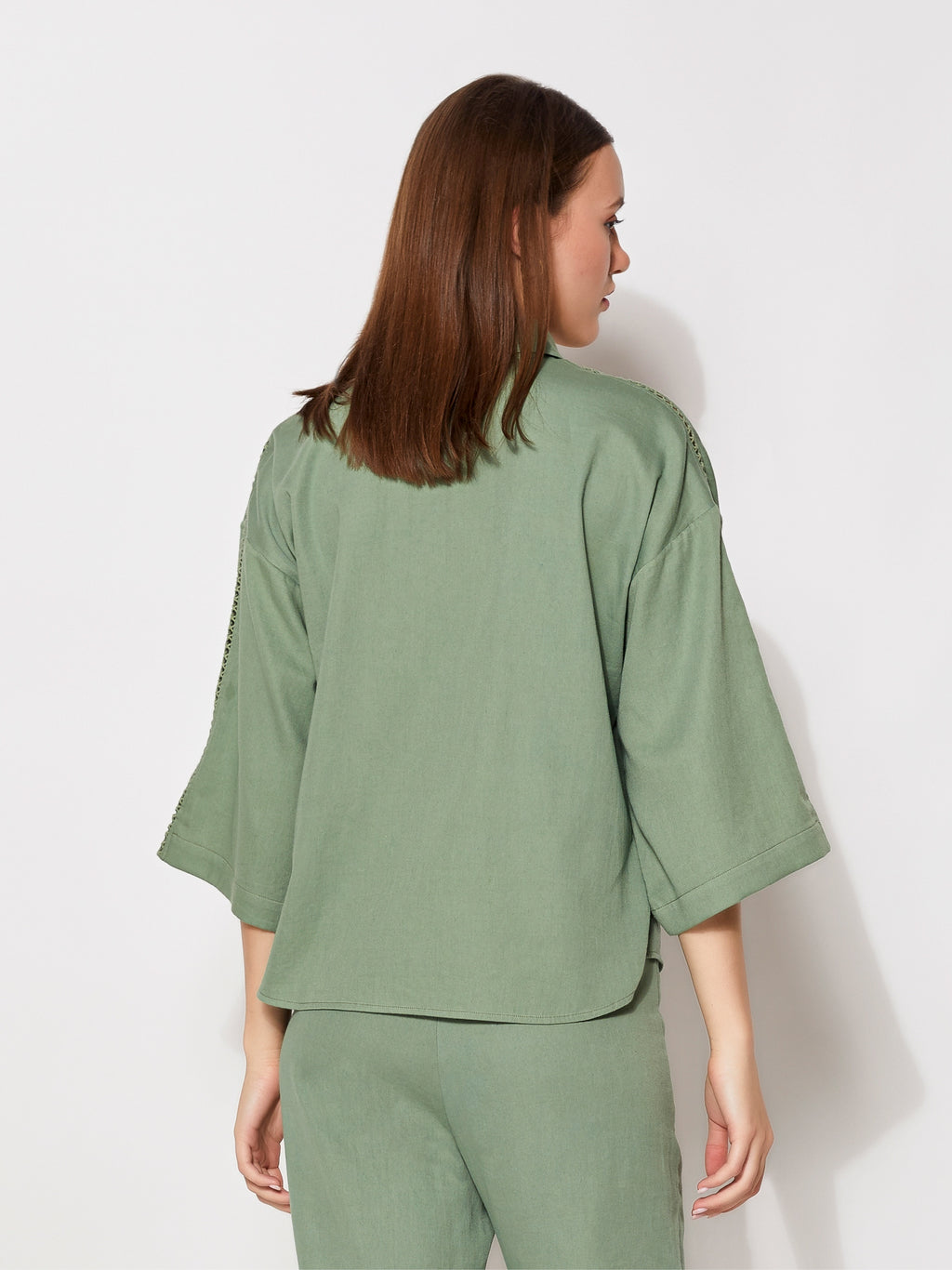 Since loungewear is the new wardrobe essential, this collared crop shirt is an indispensable addition to your edit. Made from sustainable cotton fabric, it has a relaxed silhouette with dropped shoulders, a three-quarter length sleeve with lace insert and a reverse collar. Style with the label's lounge pants to complete the look.