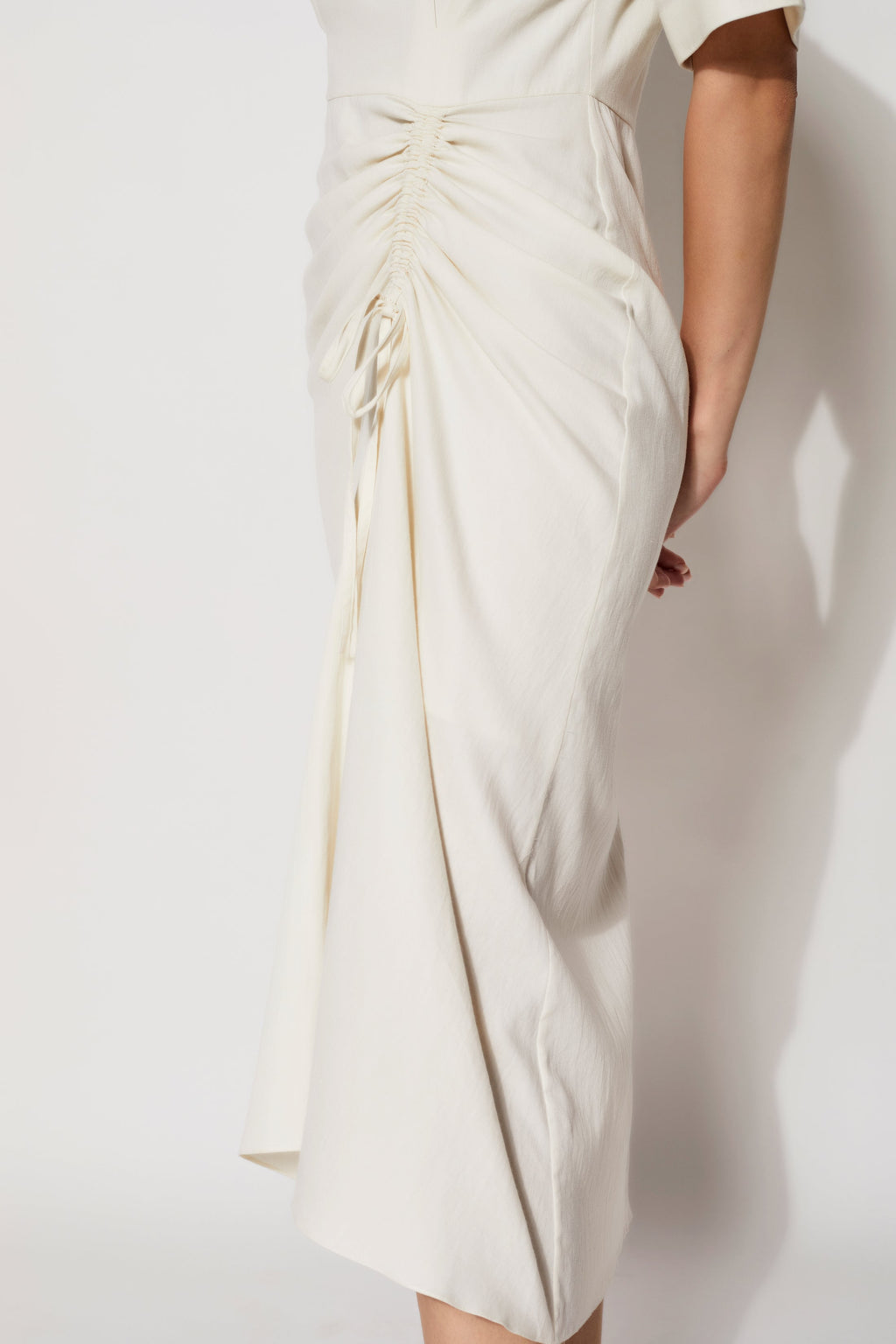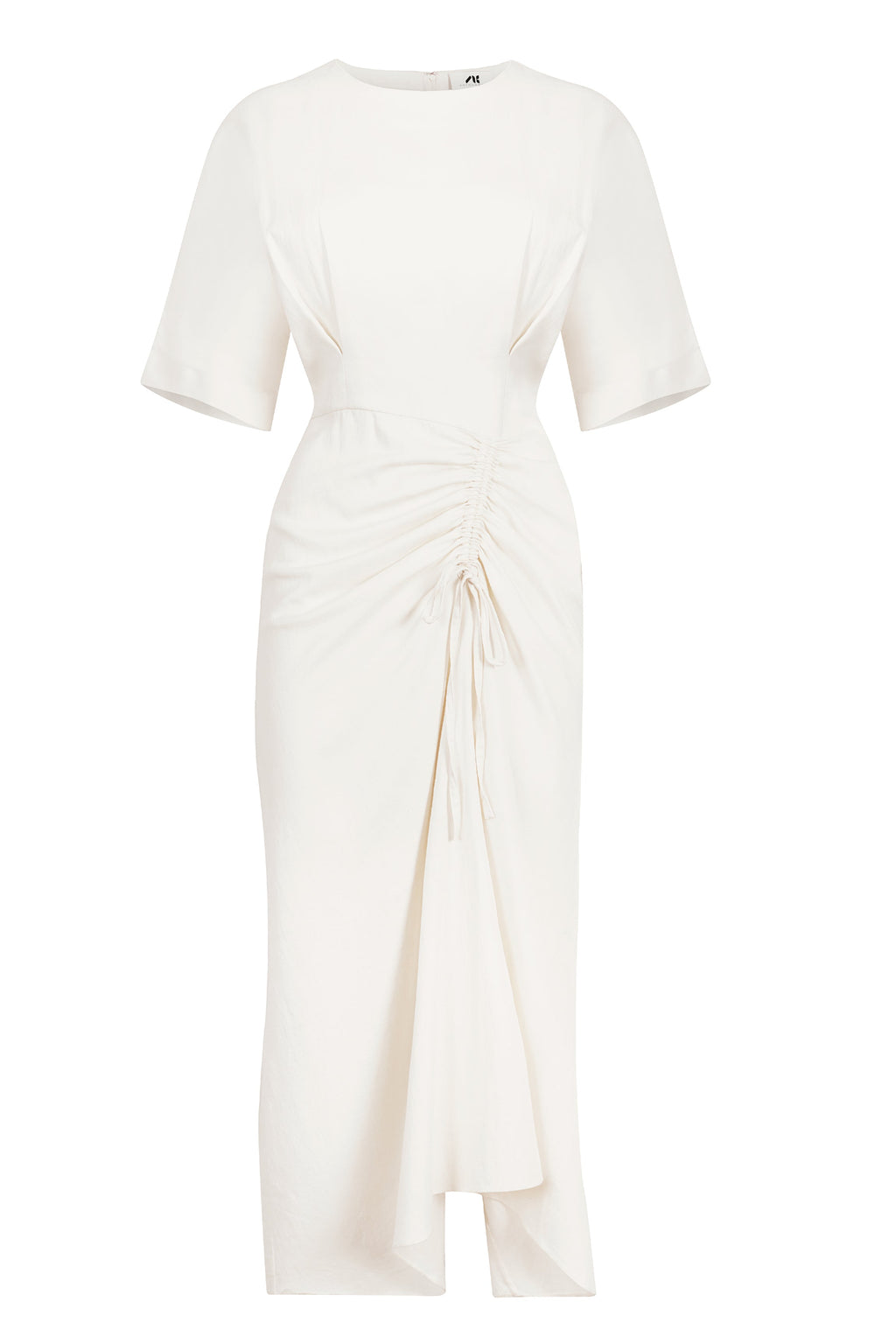 Sleek style with this Ruched Drape dress. In a neutral white hue, featuring this mid-length dress with a tie fastening, an elegant drape and three quarter sleeves that incorporates an eye-catching finish and all-over ruching for a gathered effect.