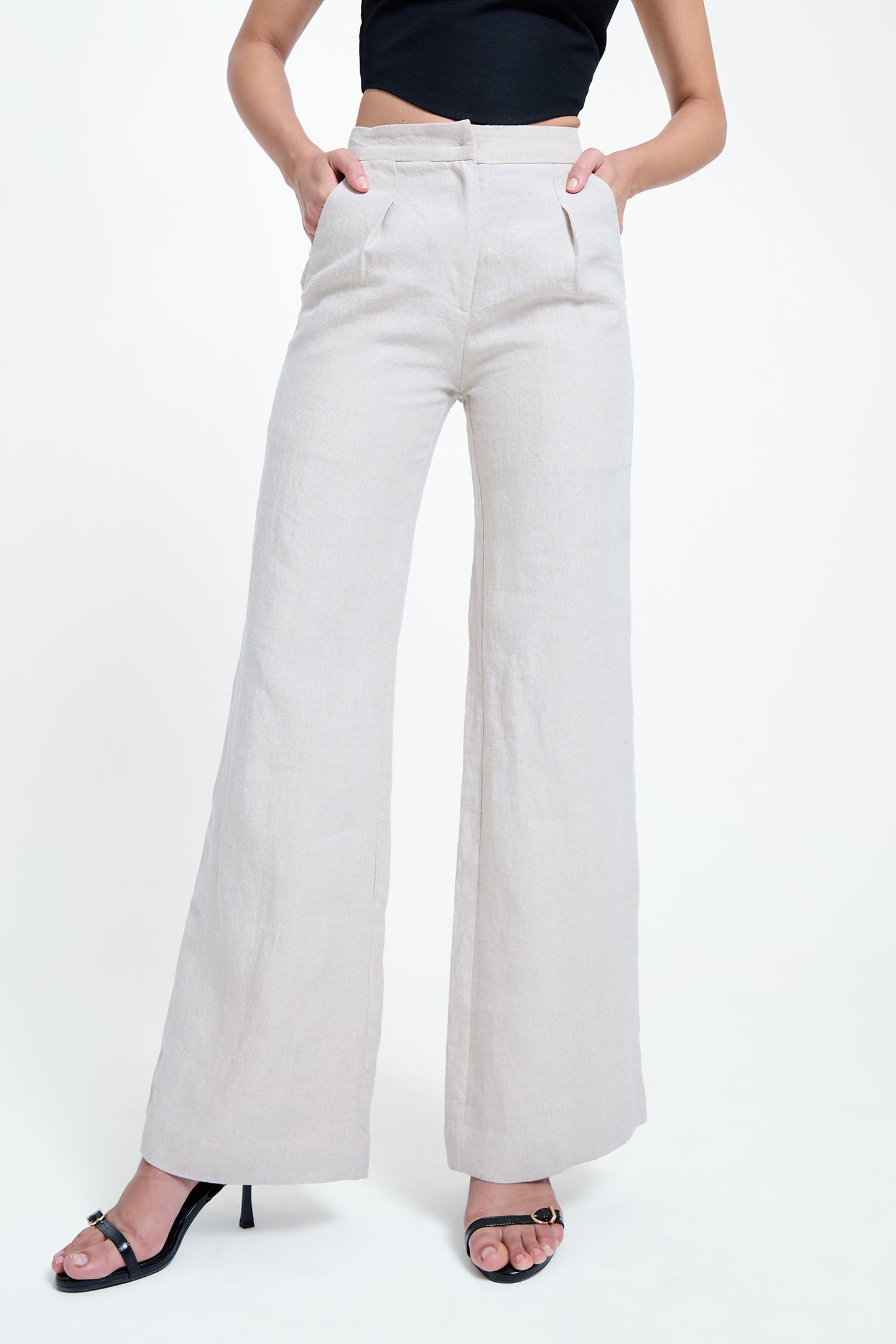 Crafted from 100% breathable linen, these flared pleated pants are a wardrobe staple for warm-weather dressing. Featuring a structured silhouette, clean front pleats, and a wide-leg cut, they’re perfect for office days, travel, or casual weekends. Designed with comfort and ease in mind, the lightweight fabric ensures airflow, while the tailored fit flatters every shape. Style them with a crisp shirt or a cropped top for a modern, elevated look.
